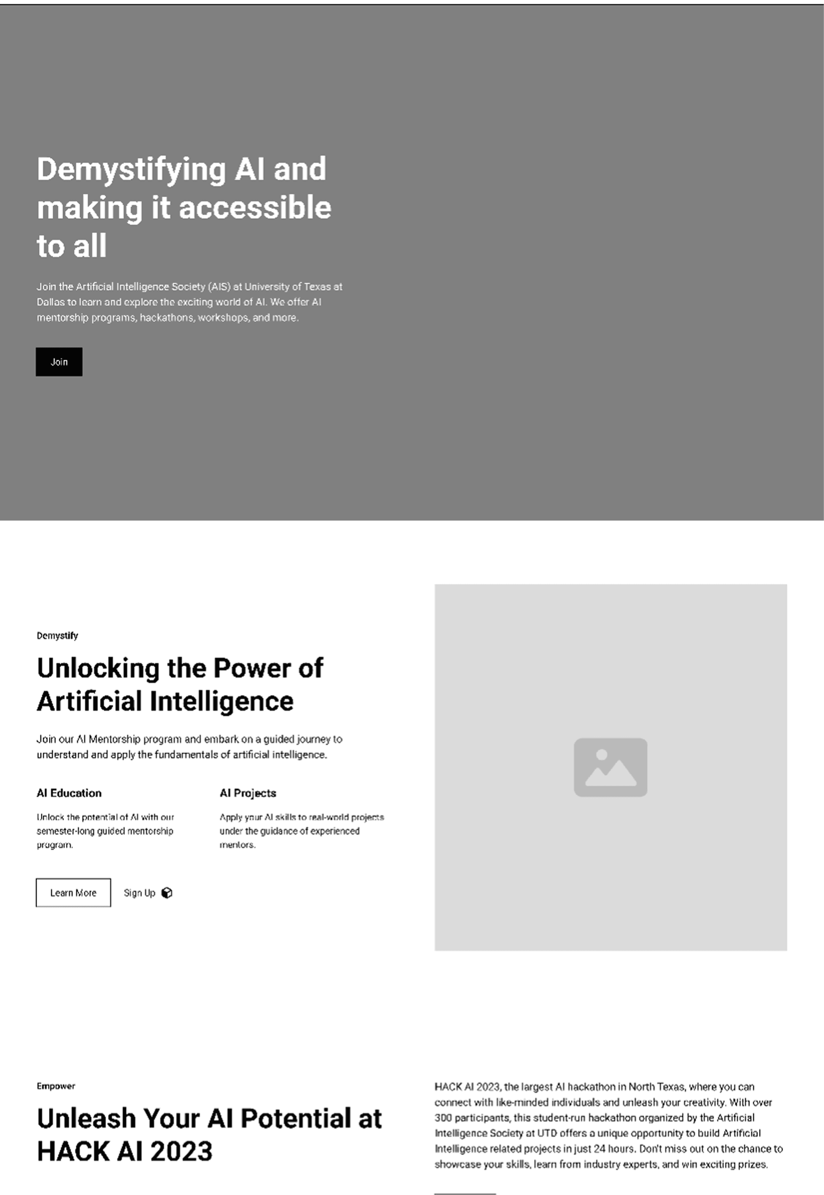 The Artificial Intelligence Society (AIS), a non-profit student organization at UTD, had a cluttered website that failed to convert visitors into members. Through competitive analysis and user testing, I redesigned the site with clear visual identity and intuitive hierarchy.