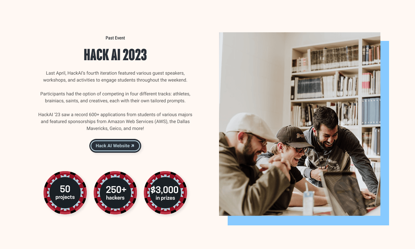 Redesigned event architecture prioritizes featured content while maintaining comprehensive access to workshops, socials, and hackathons.