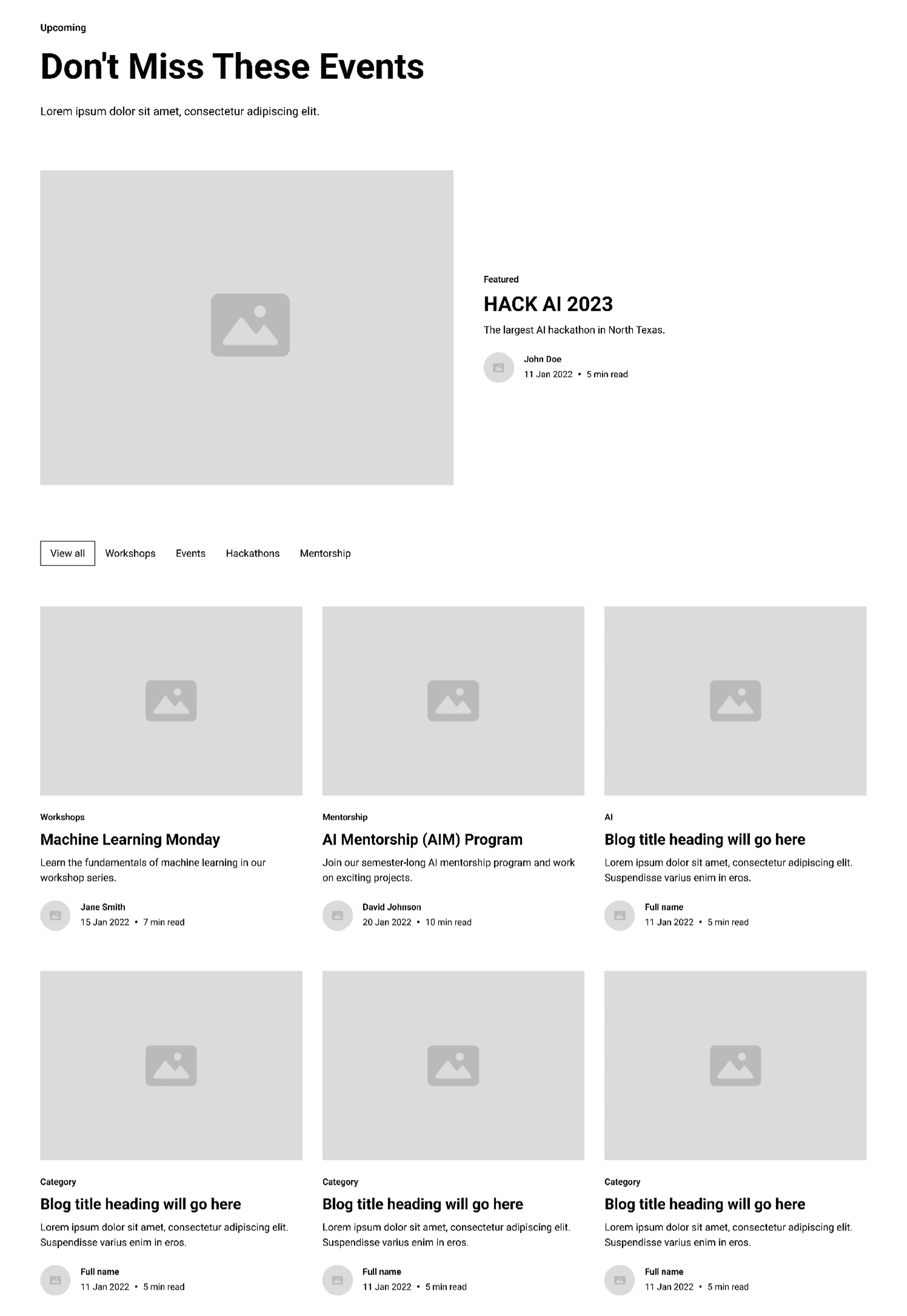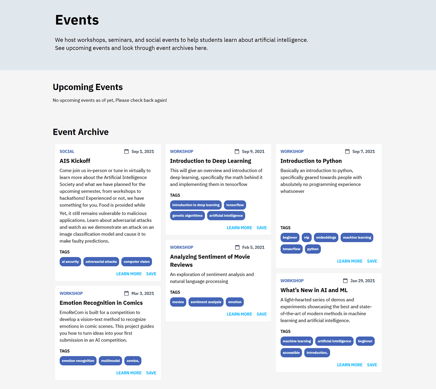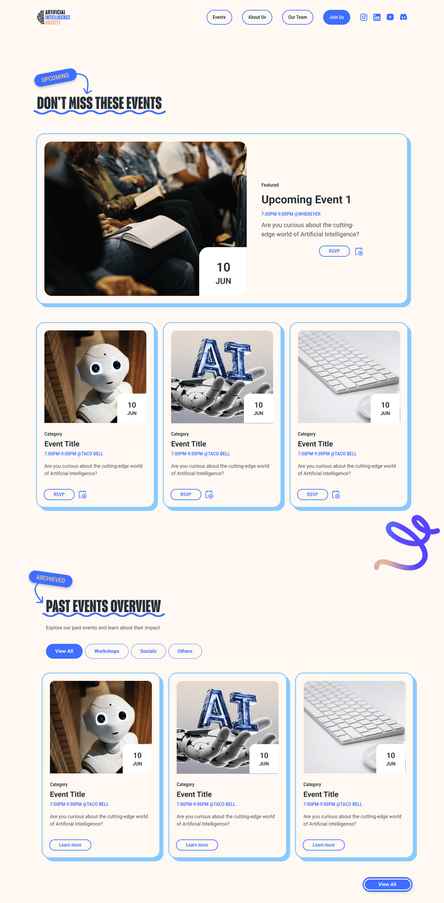 Clear categorization — Upcoming vs. Archived separation with filter buttons (View All, Workshops, Socials, Others)