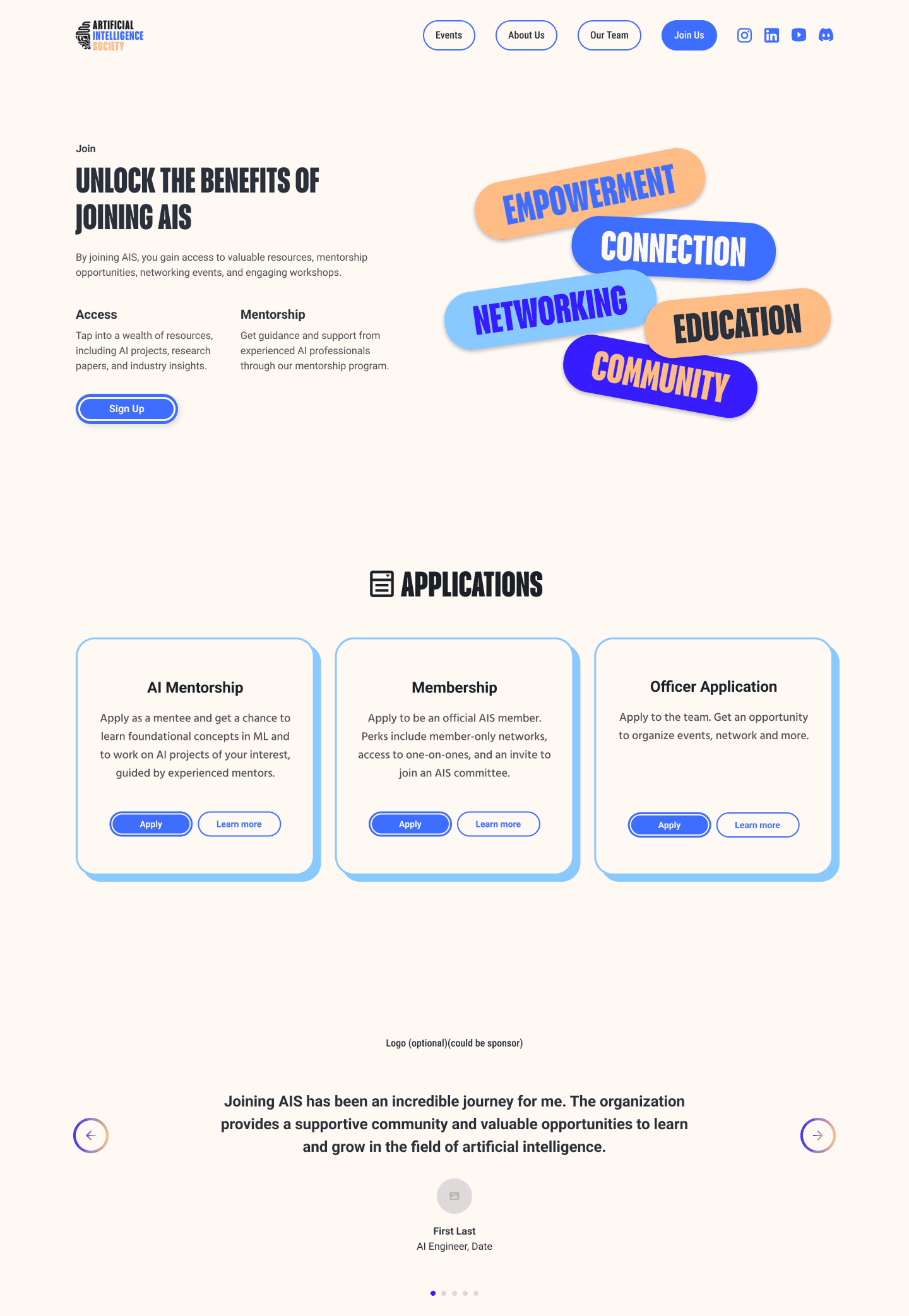 The hero section immediately communicates AIS's mission with a bold statement and CTA. Events preview below fold drives engagement, while AI-themed visuals establish strong brand identity.