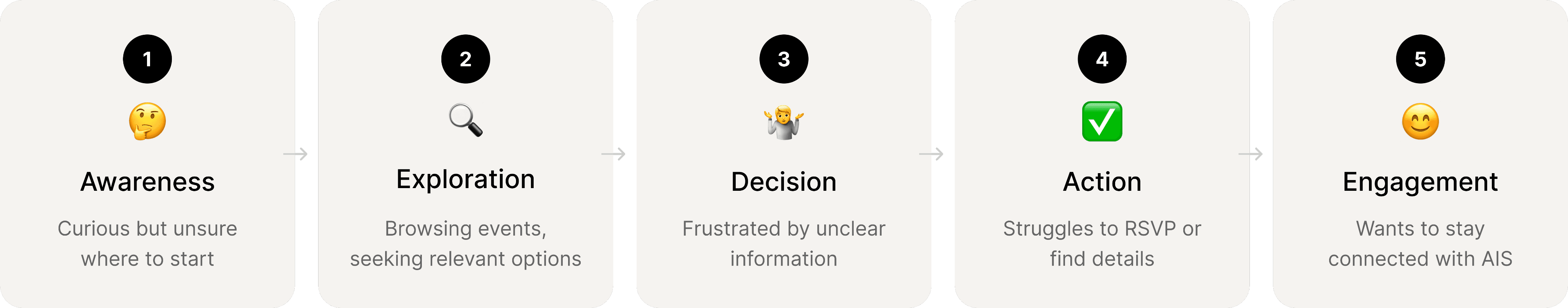 I created a To-Be user journey map of Sarah's experience finding and attending an AIS event to identify pain points and uncover opportunities for a smoother, more engaging user flow.